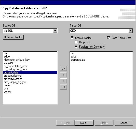 On the first page select the source and target db location (which you setup during the configuration process). Use Retrieve Tables to list the tables of the source db location. Choose the table(s) you want to copy. If you want the table to get automatically in your target db location created just switch the checkbox on. Press next if you want to proceed.