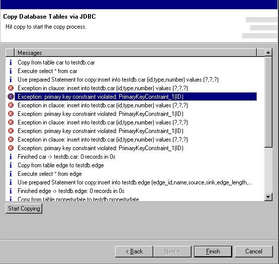 | Standard Mapping | [Create Tables] is enabled. [Copy FK Constraints] is enabled. No column mapping can be specified. | The creation of FK constraints fails | The table will be created without FK constraints. The copy process will not stop. Note that tests with different databases have shown that this feature doesn't seem to be very stable. This is mainly due to different implementation of the IMPORTED KEYS specification of each JDBC driver. But give it a try you might be successfull anyway ;-) |